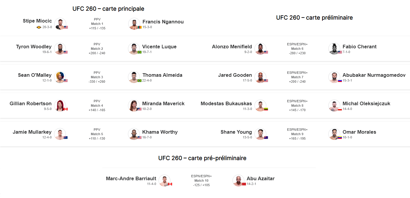 Pour suivre tous les matchs de l'UFC 260 dont Stipe Miocic vs Francis Ngannou en direct, il vous suffit de le faire via la chaîne de diffusion de la rencontre. Nous ne pouvons en effet pas vous donner de liens streaming pour voir cette compétition de MMA en streaming car cela est illégal. Nous sommes seulement autorisez à vous fournir la chaîne de diffusion de ce match.